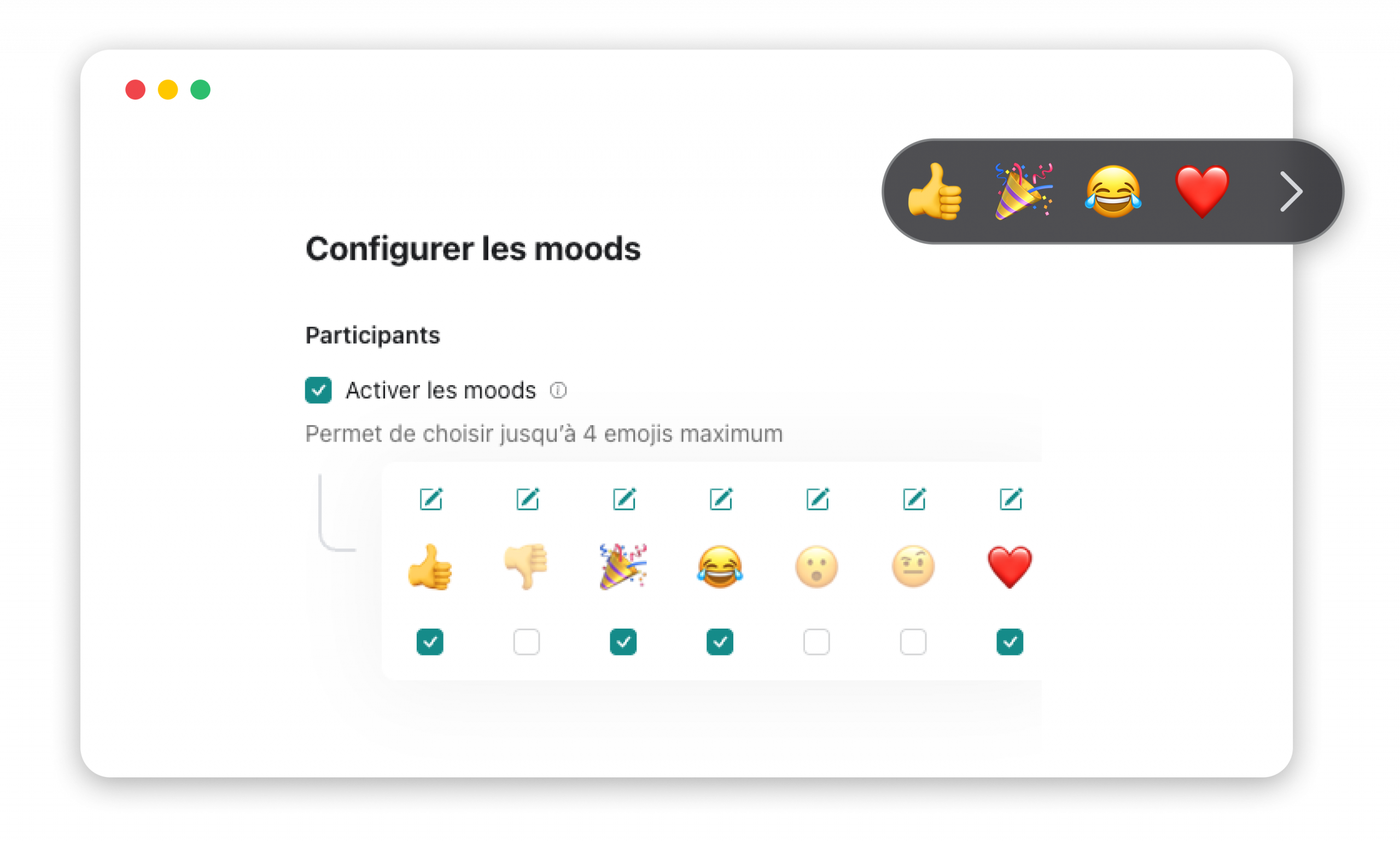 Saisissez l’opportunité de capter les ressentis, idées et pistes d’amélioration directement depuis vos sessions. Faites de vos collaborateurs des acteurs de vos décisions collectives.