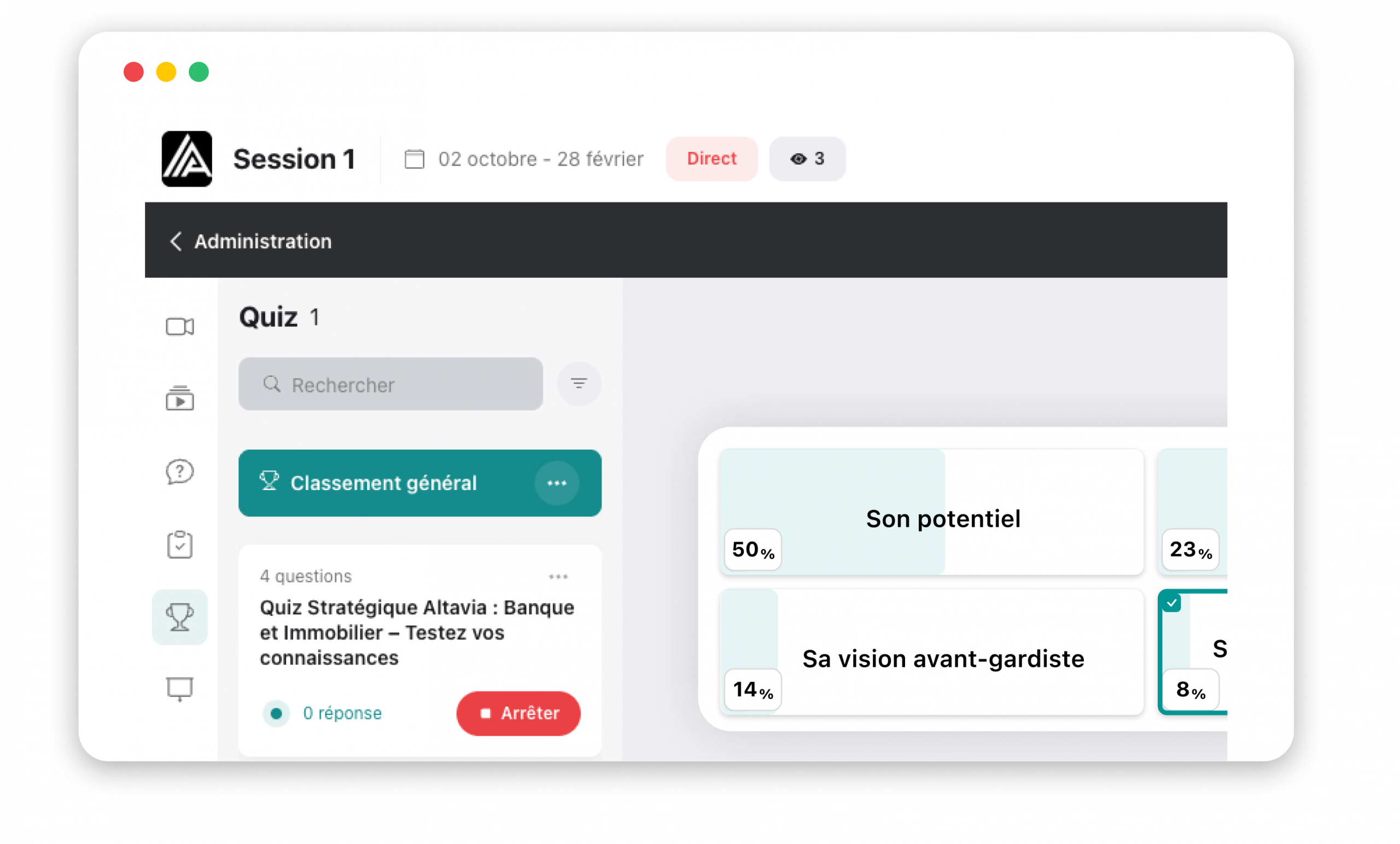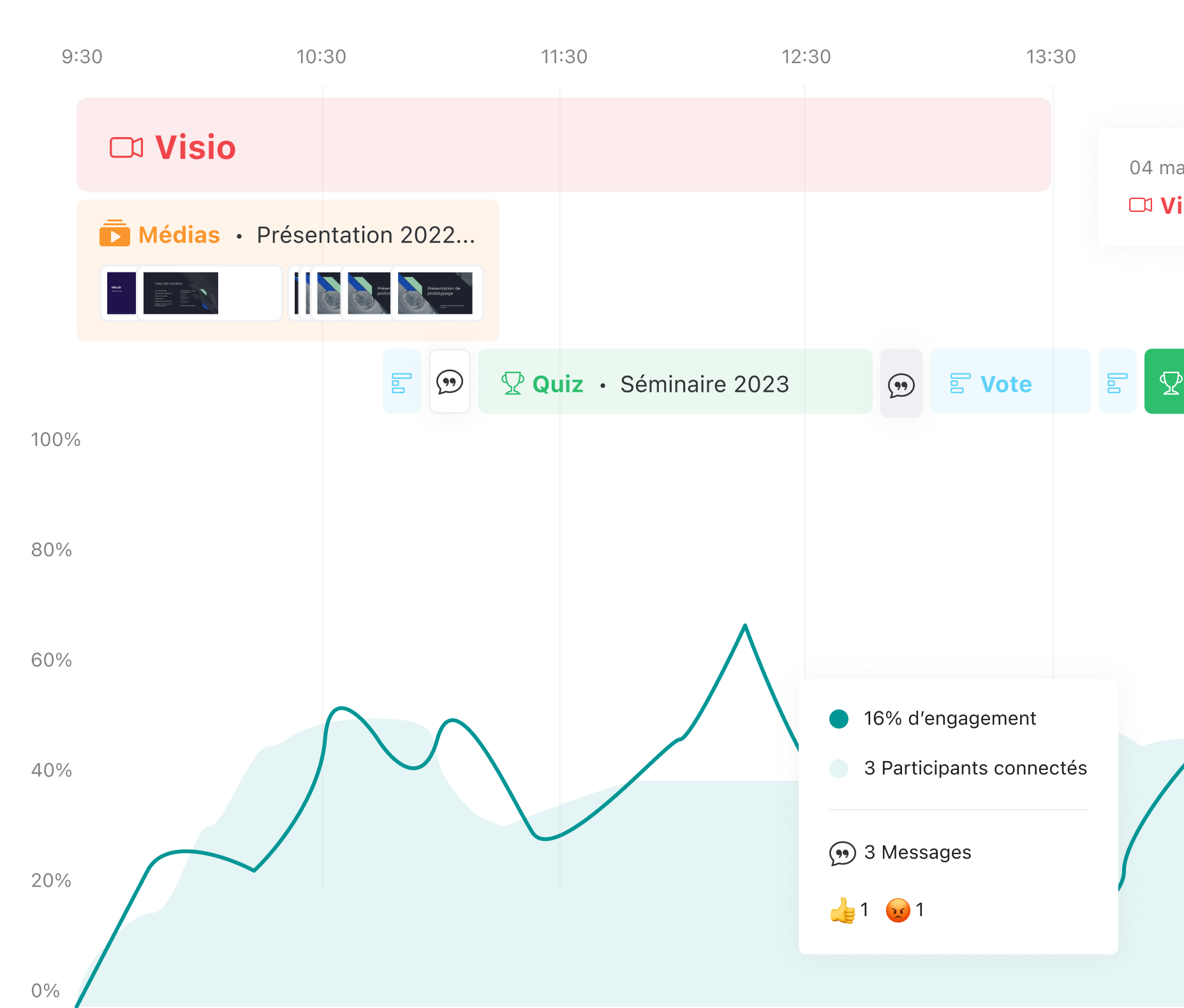 Animez vos séminaires avec des activités interactives accessibles sur mobile. Quiz, votes, nuages de mots ou classements stimulent la participation et favorisent l’attention et renforcent la cohésion au sein de vos équipes.